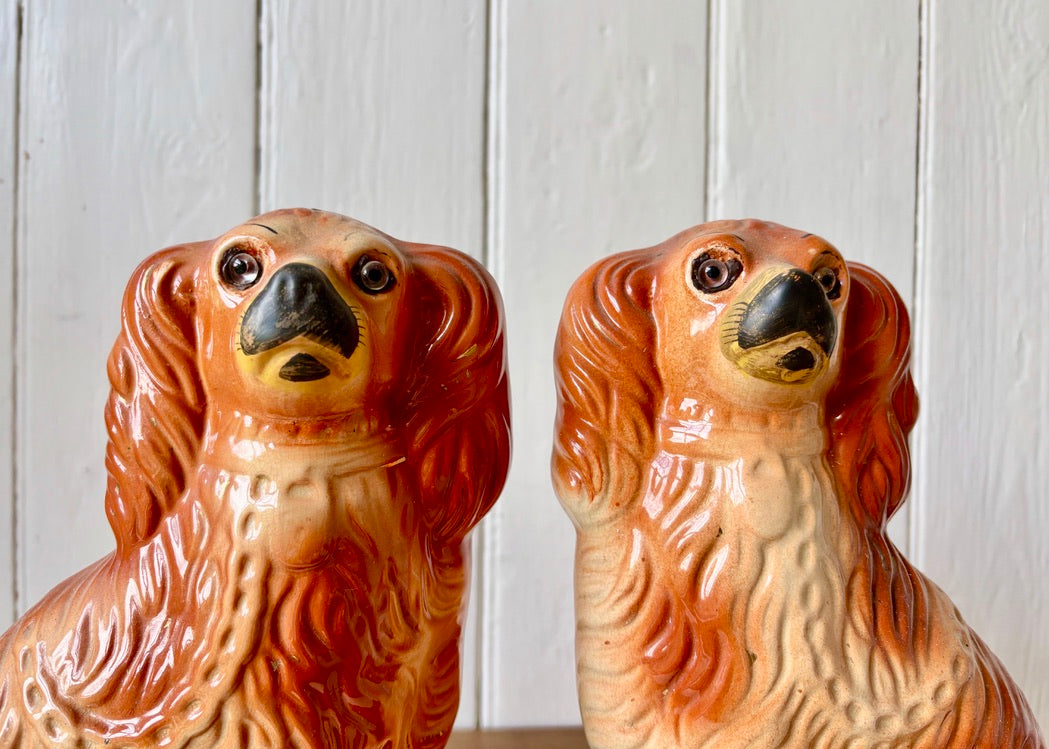 This antique pair of Staffordshire mantle dogs is chestnut and beautifully coloured with glass eyes! Increasingly rare, they date from circa. 1890.