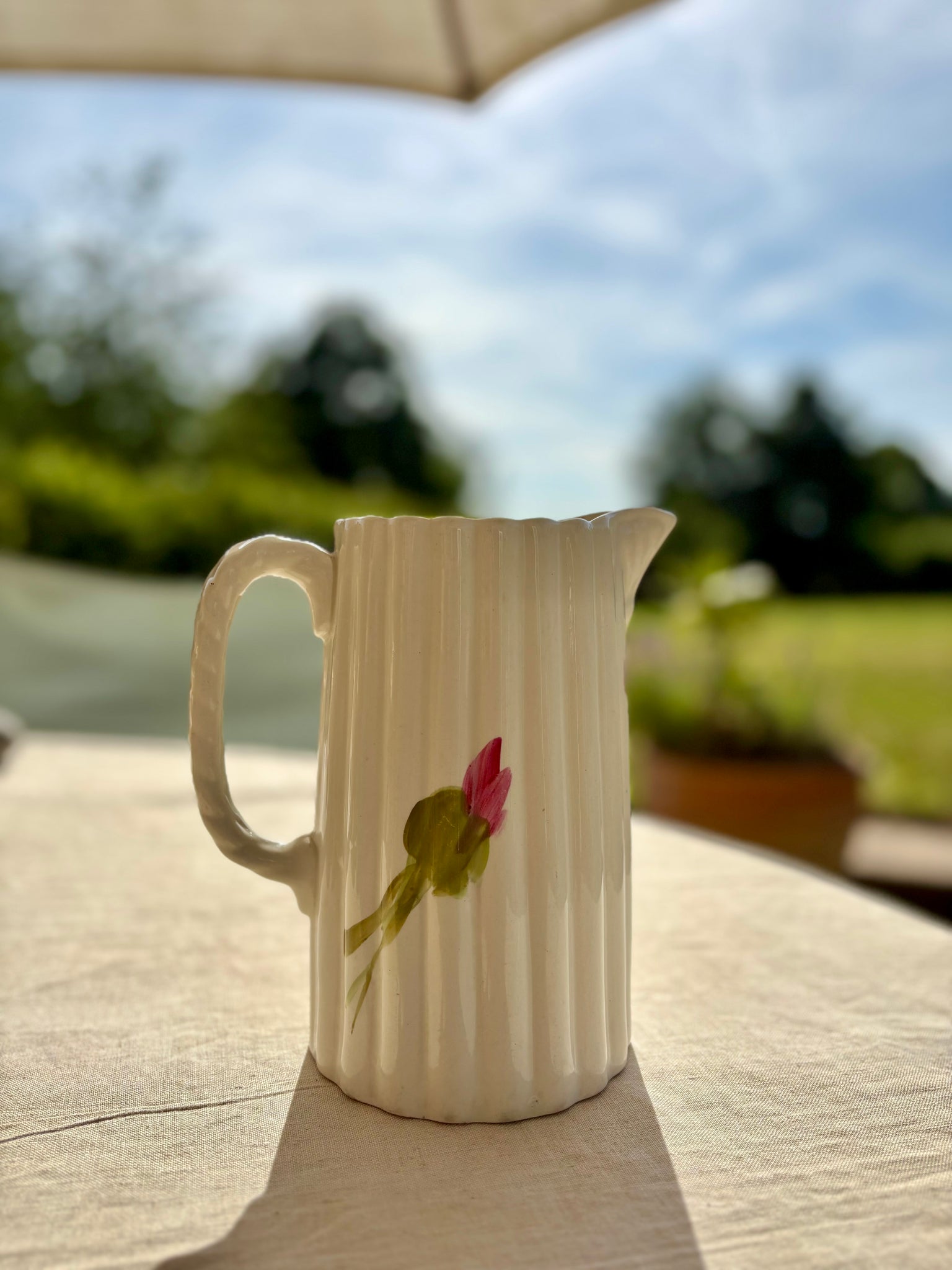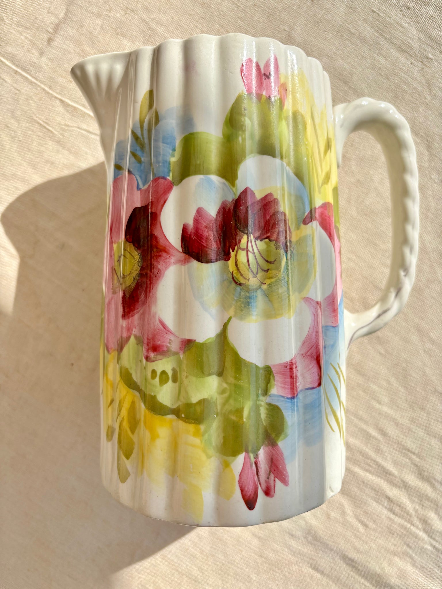 This pretty Victorian jug has a beautiful hand painted floral decoration and a lovely barley twist handle. A generous size, a simple abstract flower bud is on the other side. A most decorative and useful piece.