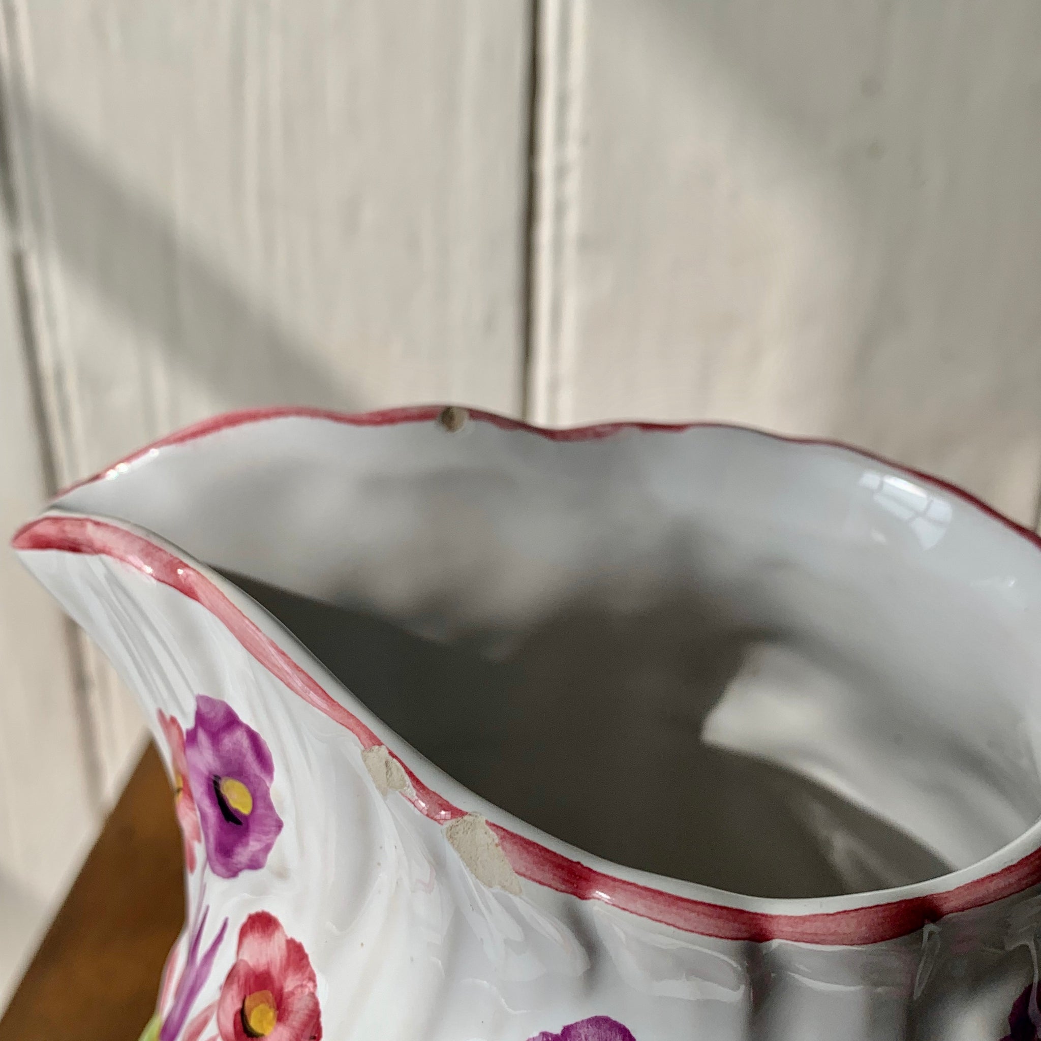 Large fluted jug with pick and purple posies and pink trimmed rim.  Perfect for pouring Pimms or lemonade this summer, it also makes a super vase.
