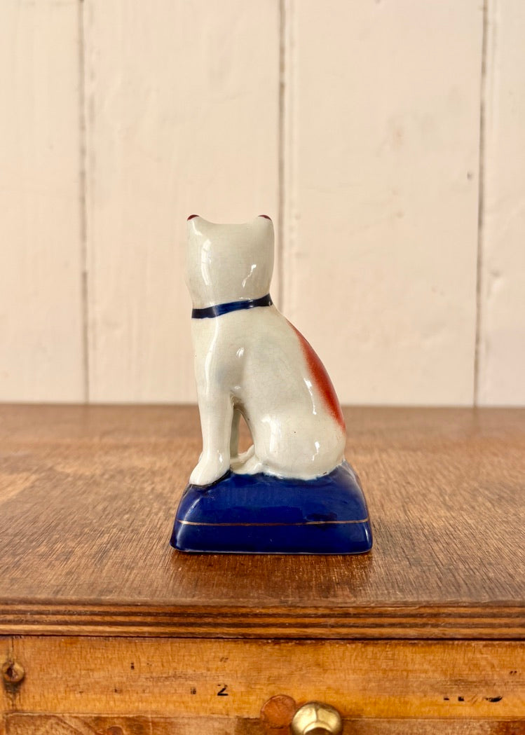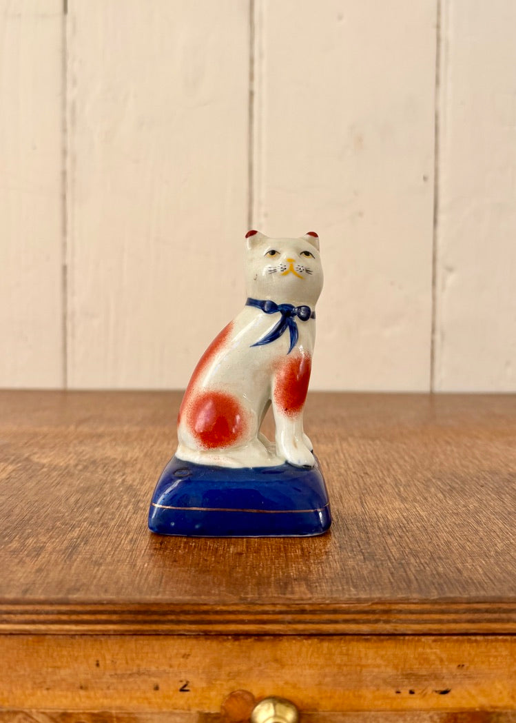 A small cat with hand painted markings and a pretty blue ribbon seated on blue cushion. A sweet decorative piece for a mantle or shelf with a good glaze.