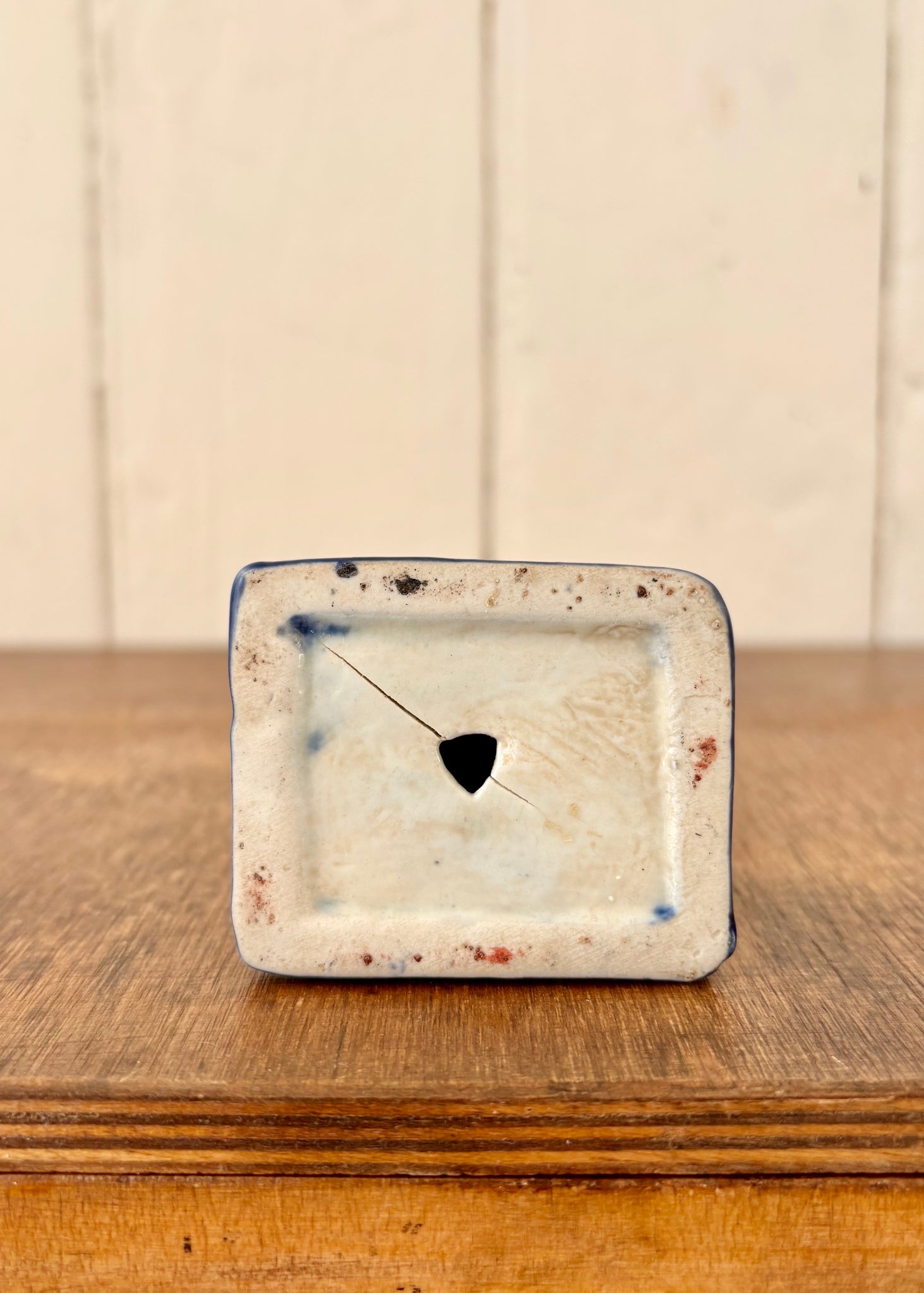 Dimensions: height 10cm, width 5cm (front to back), width 6cm. Crazing to underside of base in keeping with age and small firing crack (not damage).
