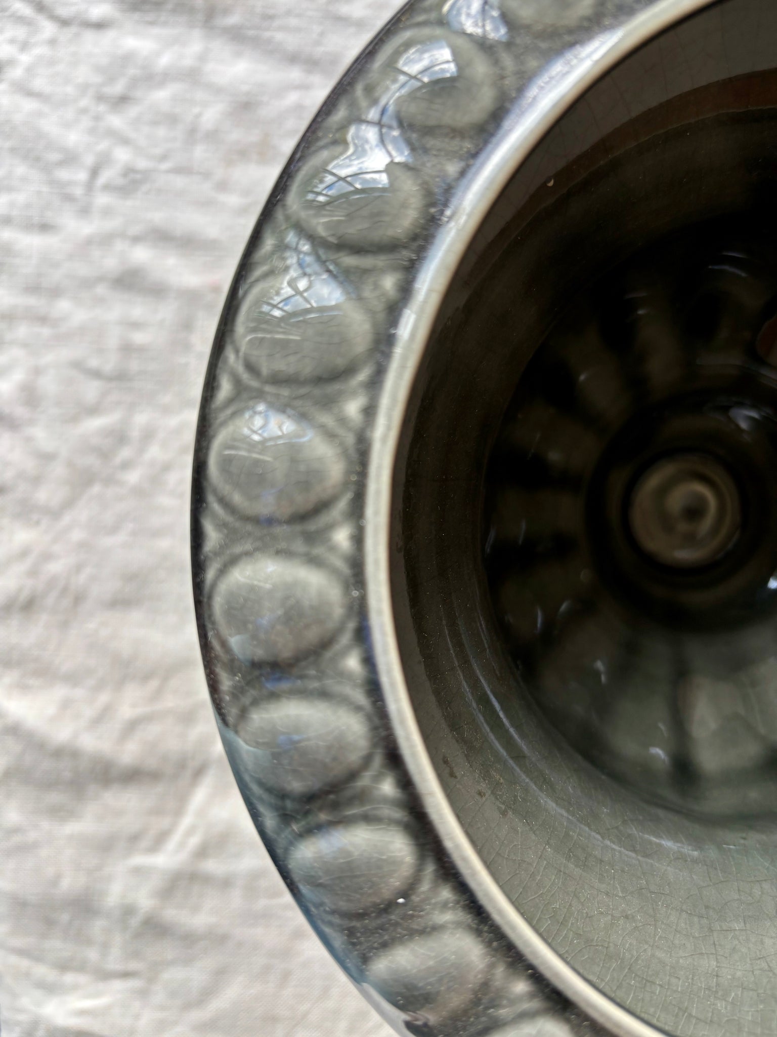 Classical dark grey ceramic urn by Holkham Pottery with flared bowl and repeated egg and dart detailing around rim. High gloss glaze.