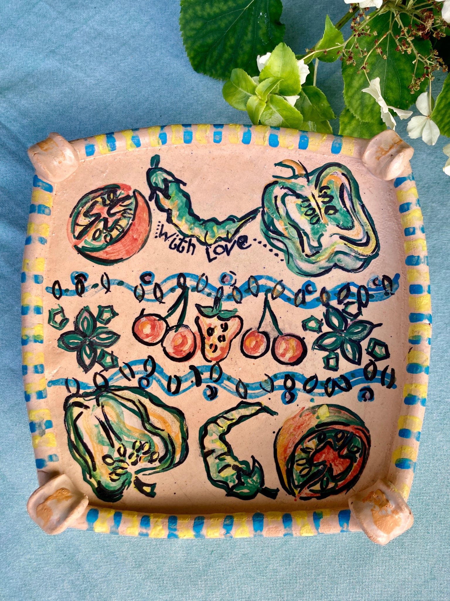 Hand made from a plaster pink clay and hand painted with fruit and vegetables, it is made 'with love'....by a talented potter. I fell in love with it and love its wonky look and characterful decoration. A great piece for the rustic table or kitchen and it sits well on a table - perfect for serving lunch or supper alfresco. A great gift too!