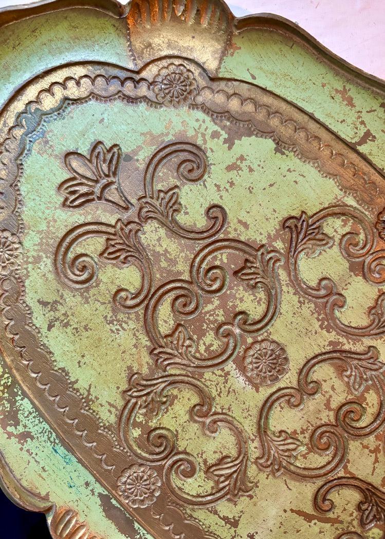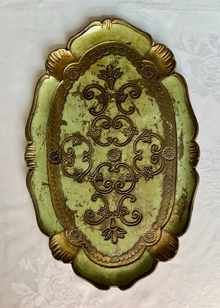A decorative and useful Florentine oval tray with gilt detailing and scalloped rim. Reverse in gold.