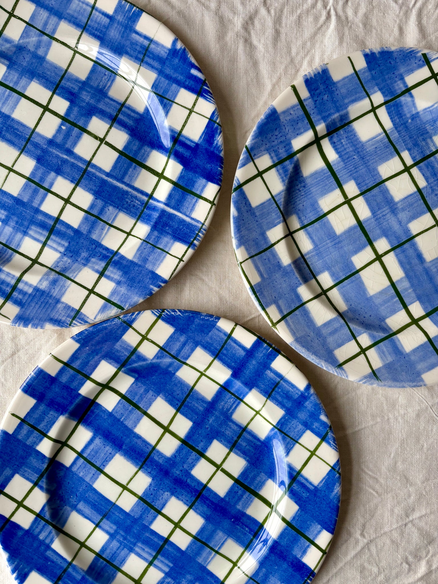 Perfect for casual lunches or summer suppers, these are a great option when entertaining friends and family this spring/summer. Blue check with a green over-stripe, these are classic and contemporary at the same time. As they are hand-decorated there is some variation between plates.