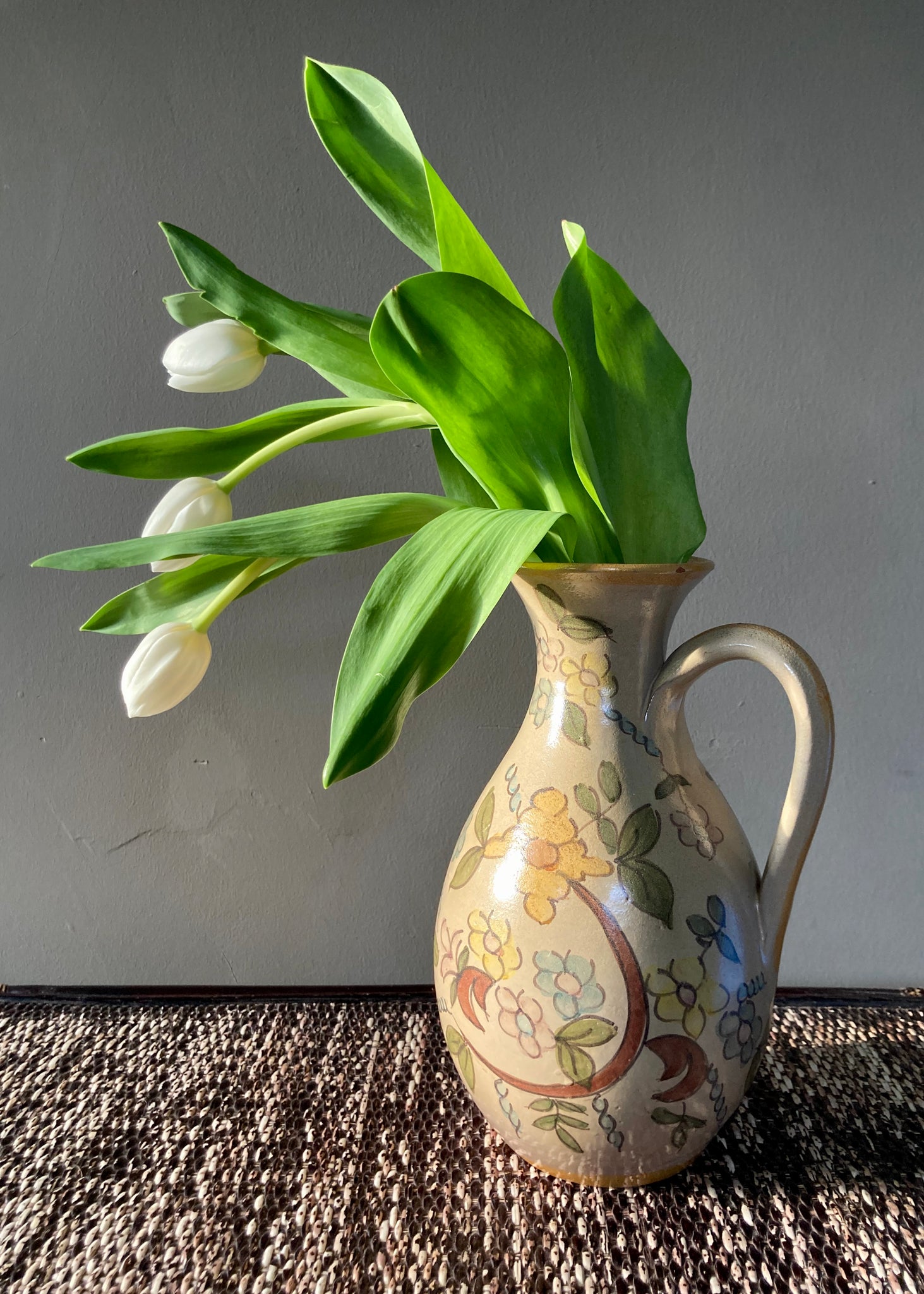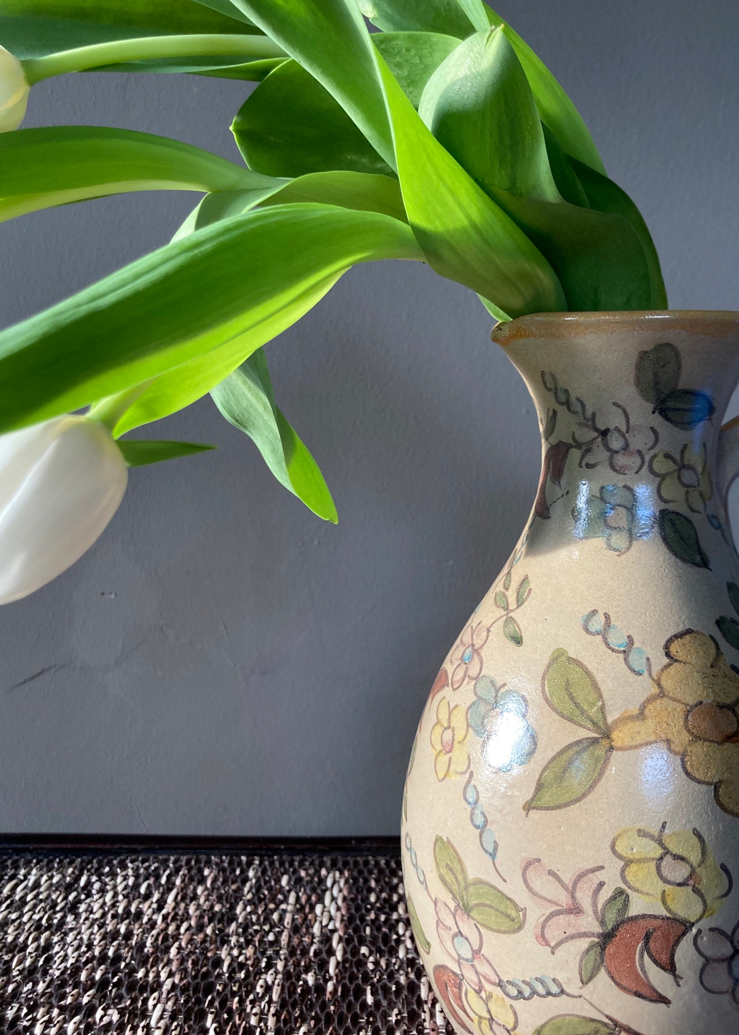This elegant jug is made from terracotta clay, hand decorated and glazed with natural earthy tones. A super and substantial piece for a modern rustic interior. Perfect as a large pitcher or useful as a vase.