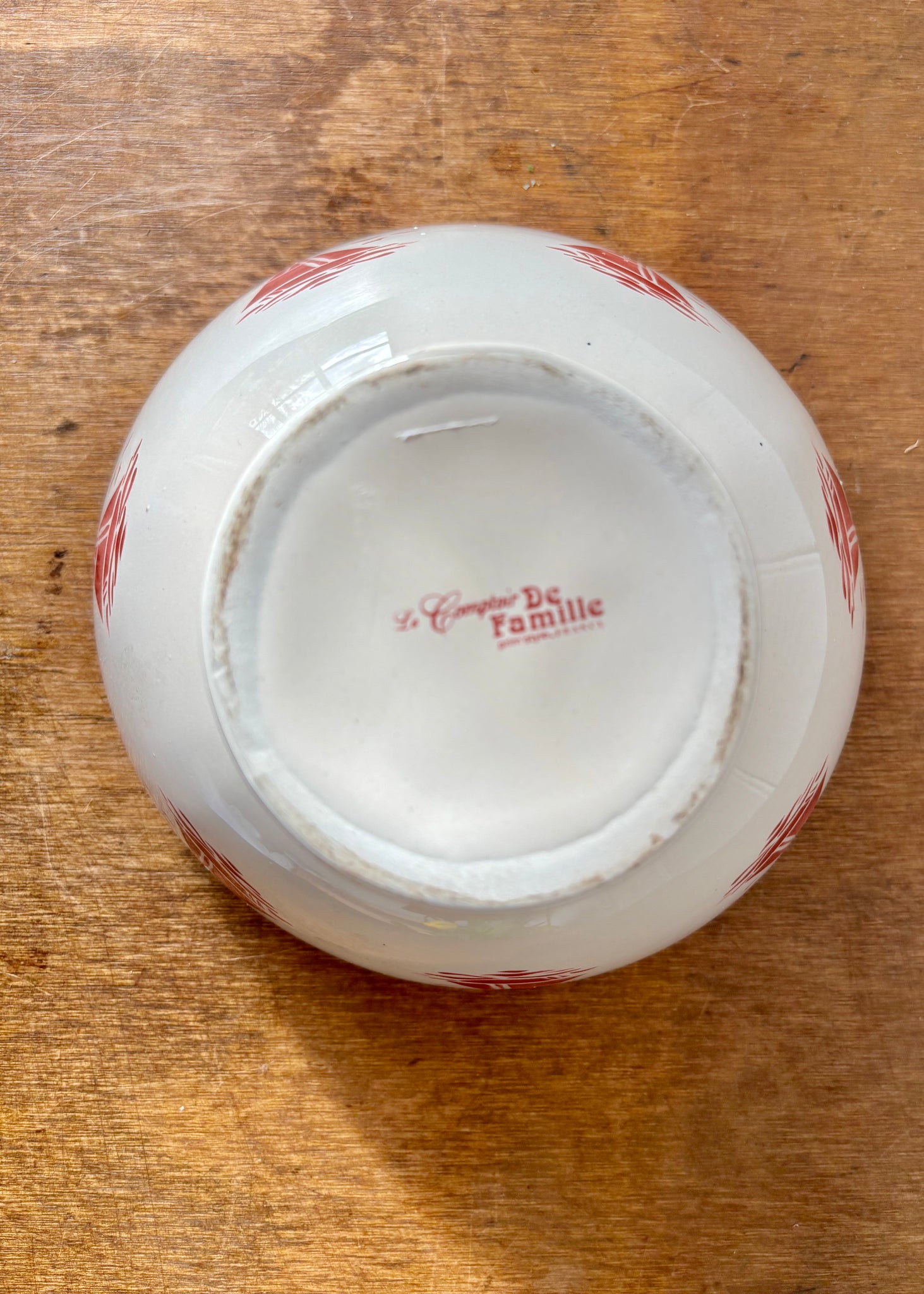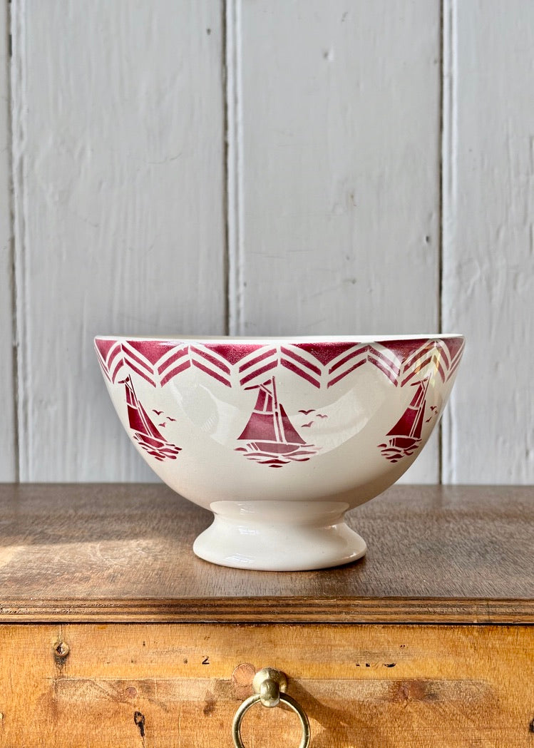 A super sized bowl by Le Comptoir De Famille, France featuring jolly red yachts and a pretty border on a creamy white footed bowl.