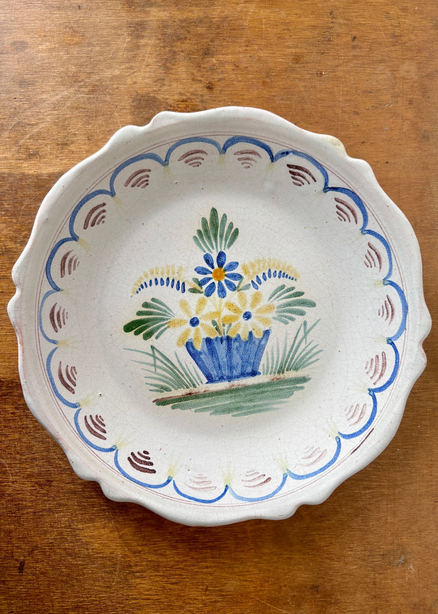 This rustic artisan-made plate has a gently scalloped edge and all details are hand-painted. The colour of the clay is visible through the glaze in places and this adds to the wonderful time-worn element of this beautiful one-off plate. The pretty faded flower basket and border design are charming. Perfect for display or occasional use.