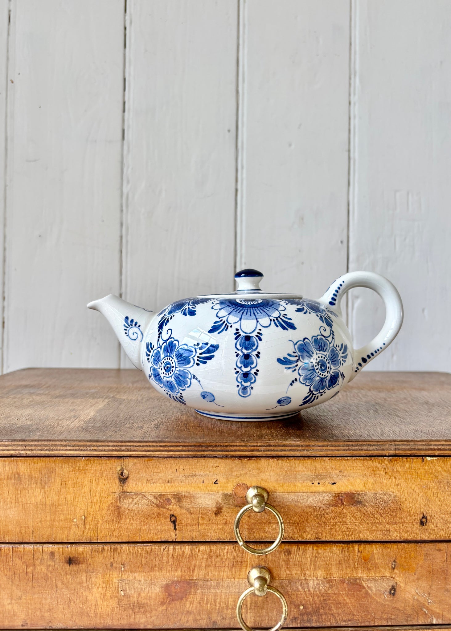 A pretty floral Delftware teapot hand painted in Holland, blue and white traditional design. A super addition to a collection.