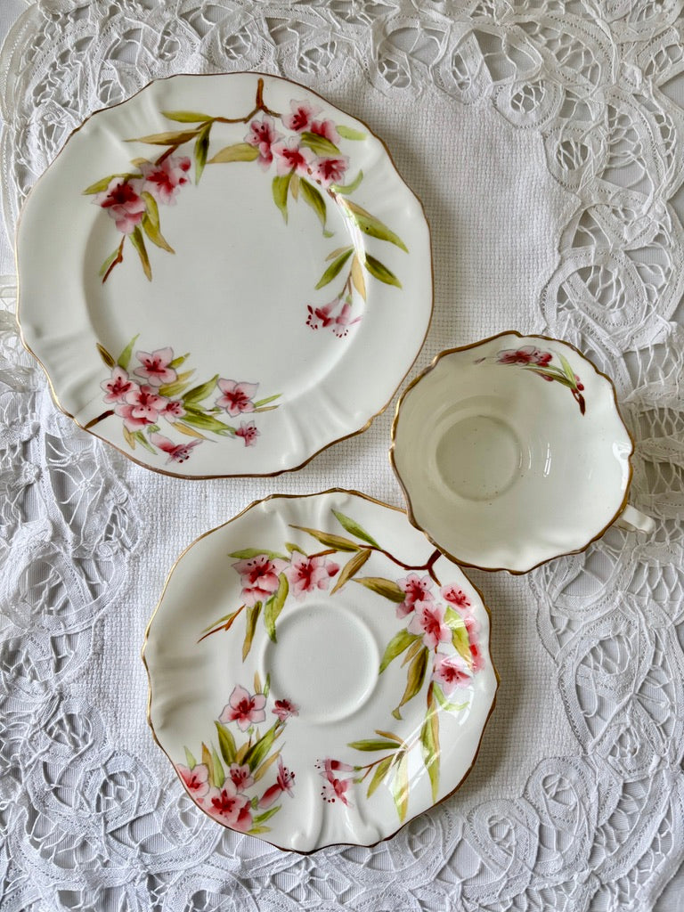 A delightful, delicate antique trio (cup, saucer and plate) with pink floral decoration, gilt edging in porcelain. Fluted edge to all and contoured shape in relief. Ideal for display.