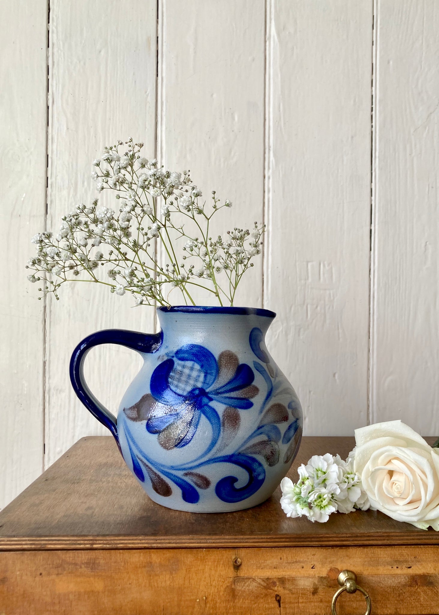 This substantial stoneware jug has abstract floral design in blues and greys and the jug is trimmed in blue. It has a 1.5 litre capacity and is perfect as a water jug or decorative piece.