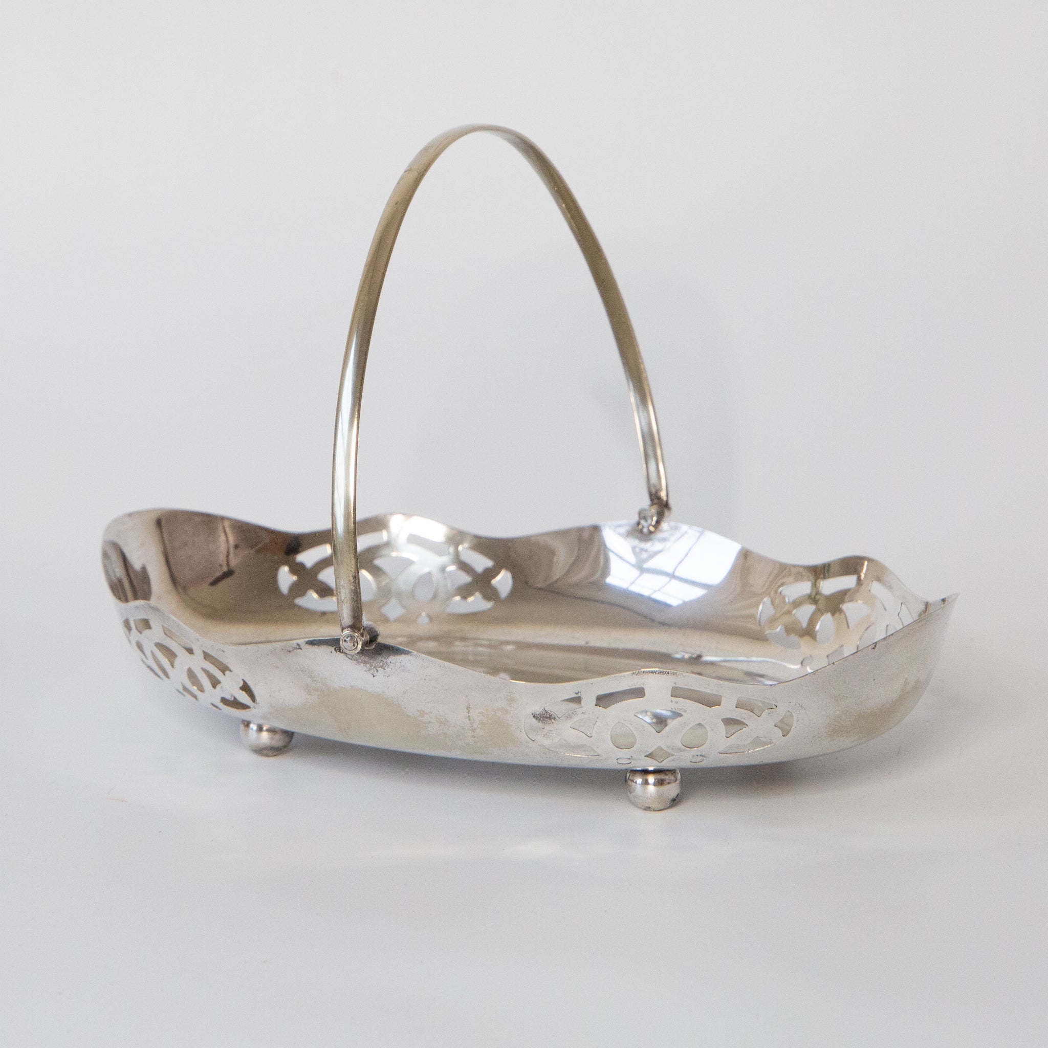 Decorative oval silver plate serving dish with hinged handle and cut-outs.