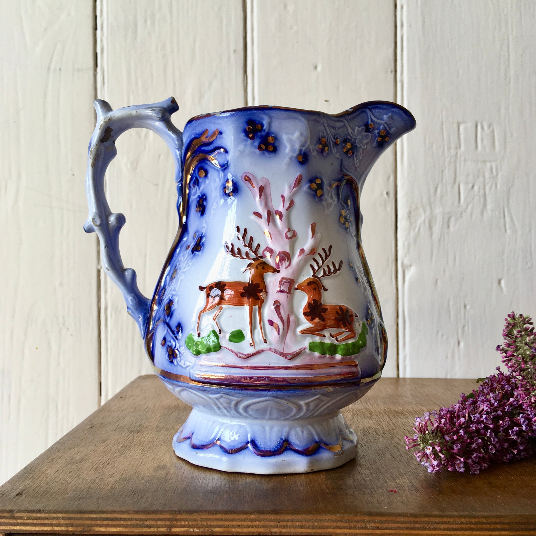 A charming Victorian Sunderland Pottery Flow Blue Lustre ware Antique 'Epsom Cup' Jug.  This depicts scenes of deer on each side - wonderfully decorative images with gilt detailing and hand painted designs.   The ivy leaves, trees and pattern around footed base are all in relief and the handle is made in the form of a tree.  The Epsom Cup is stamped into one side and this is believed to be a mid 19th century piece.  (The races have been recorded since the 17th century).