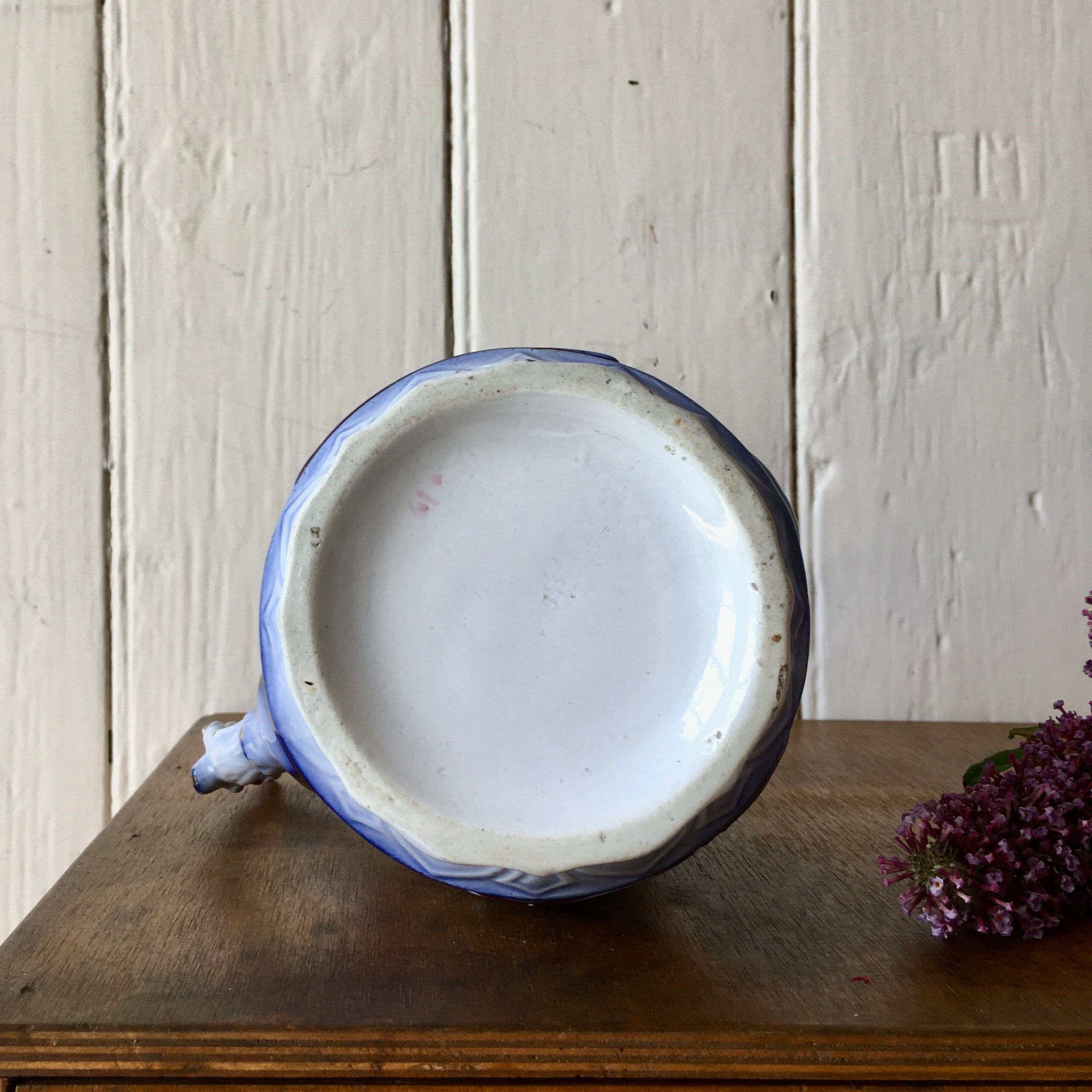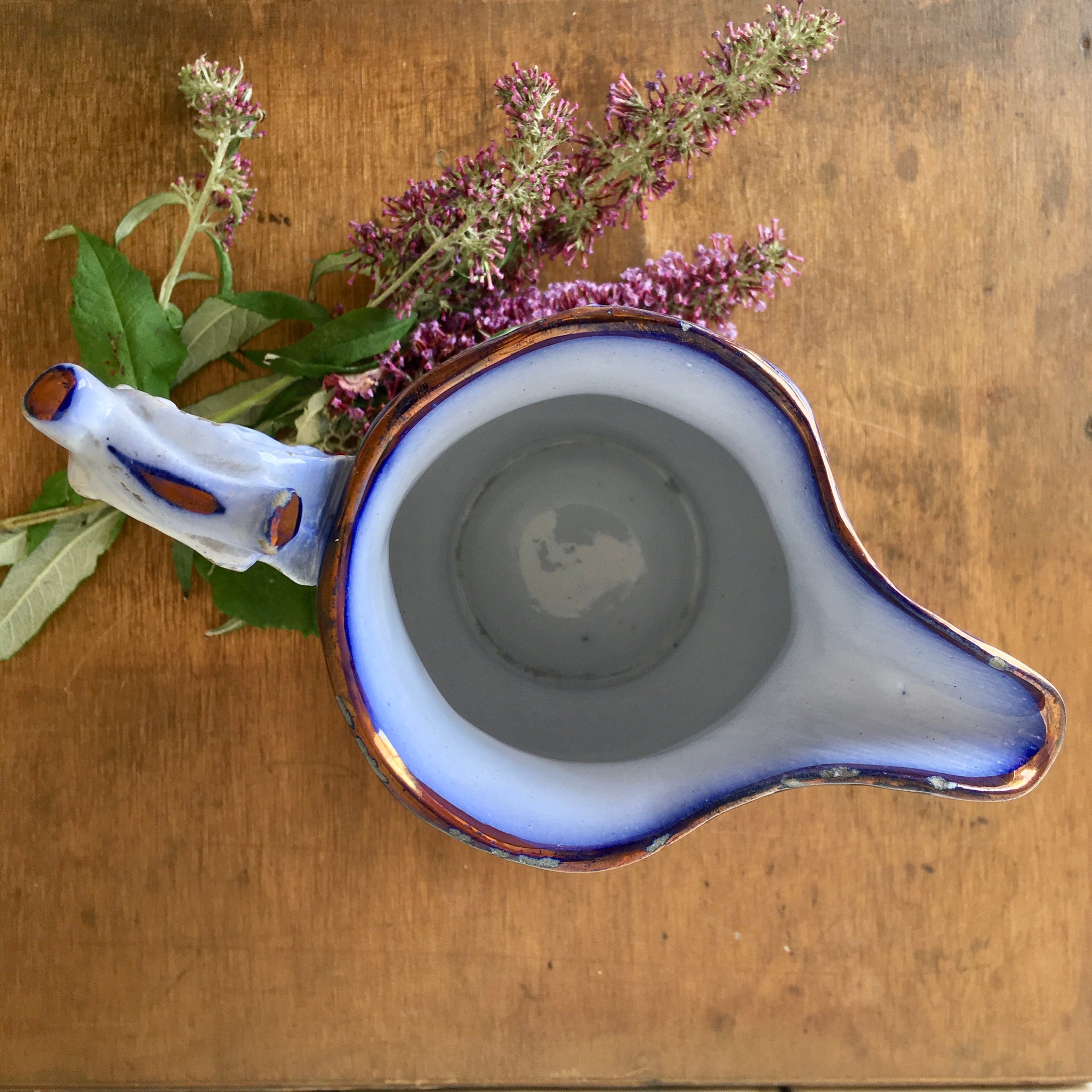 Dimensions: height 19cm, diameter at rim 9.5cm, total width 17.5cm. Wear of glaze on handle and rim consistent with age. View images as these form part of description.
